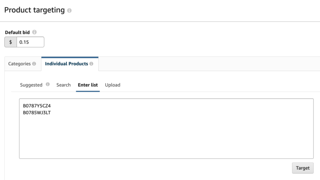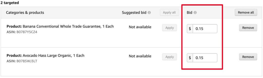 Keywords targeting広告を選択したら、あなたの商品はターゲットASINのキーワードとのギャップが大きい場合、アマゾンはより高い広告料を請求します。例えばバナナを販売していますが、ターゲットASINのキーワードがアボガドである場合です。