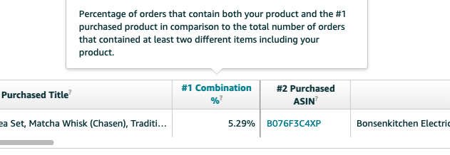 レポートは、この3つの商品の割合データを提供しています。即ち2つ及びその以上の商品(セラー自身の商品を含む)を購入したすべての注文のうち、消費者がその商品を一緒に購入した注文の割合をパーセントデータとして提示しています。