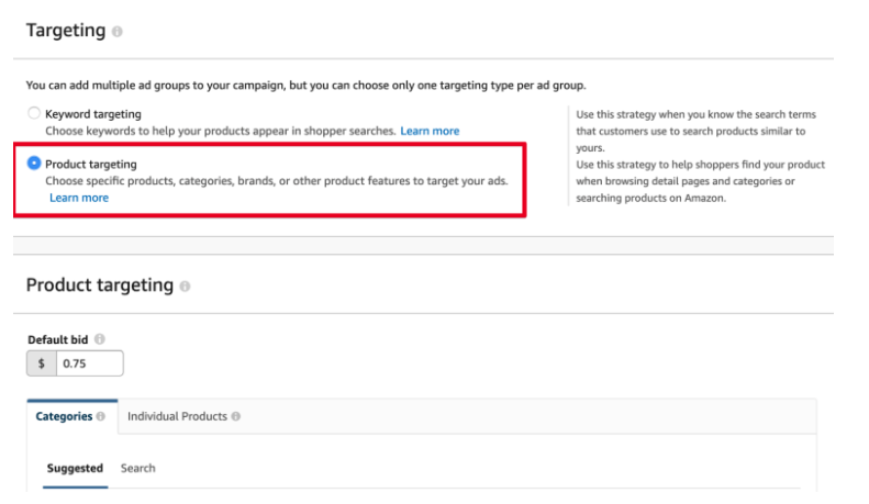 なお、Product targetingというタイプを選択したのは、この方の広告コストが低いからです。