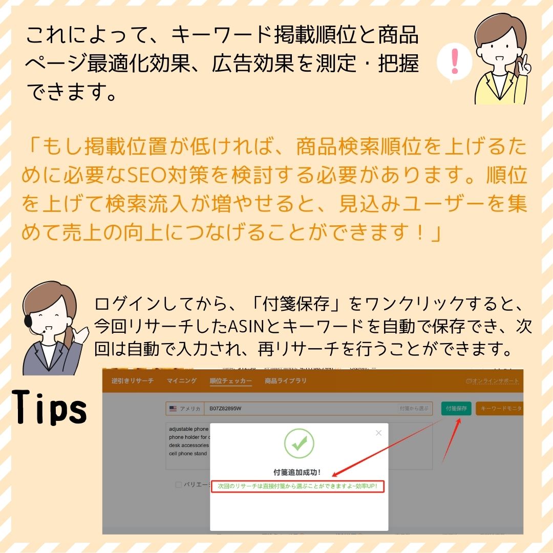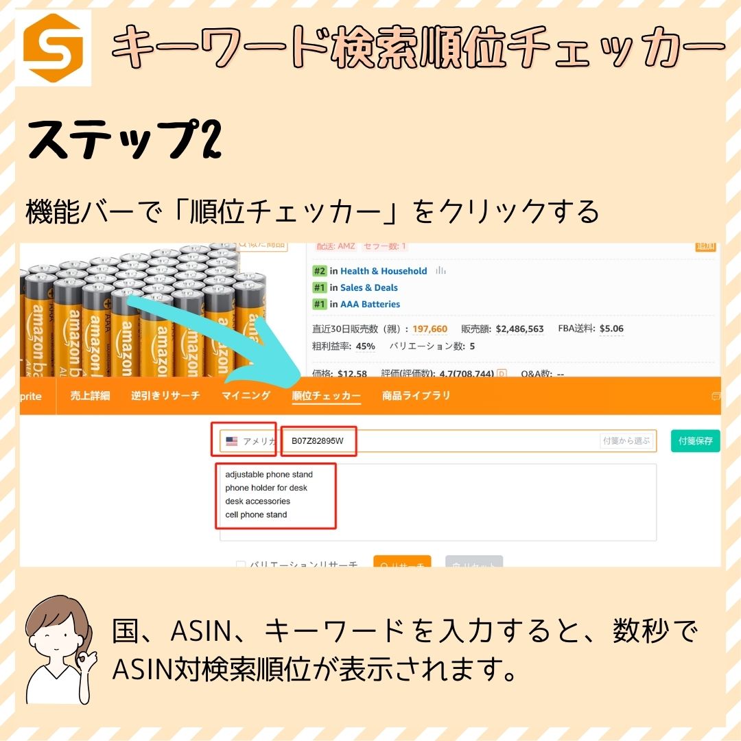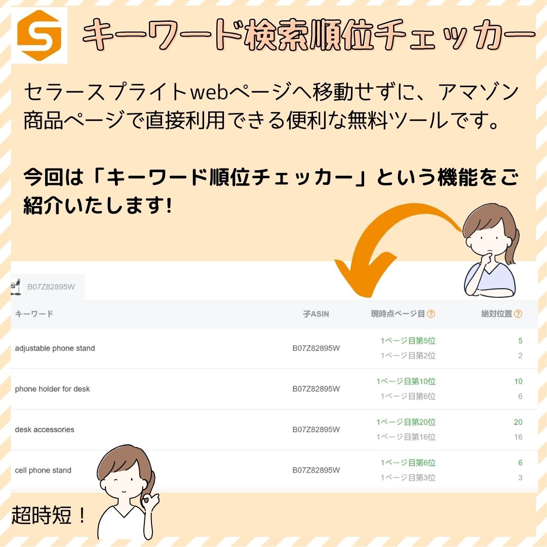この機能で検索順位をチェックすれば、Amazon検索エンジンの検索結果で自社商品の掲載位置がわかります。セラースプライトwebページへ移動せずに、アマゾン商品ページで直接利用できる便利な無料ツールです。