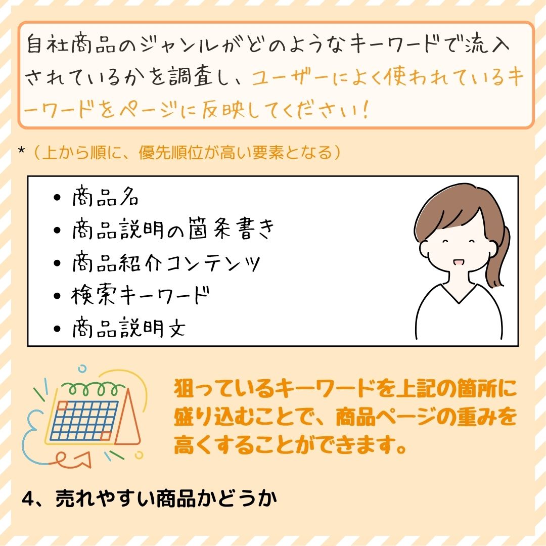 ランキング上位に入っている商品は、商品自体のニーズが高いだけでなく、その商品の魅力を商品ページでしっかりと伝えられることもあります。画像や商品説明など、どのような工夫をすれば売上アップにつながるのかを分析して、自社の商品ページを作成する際に活用しましょう。