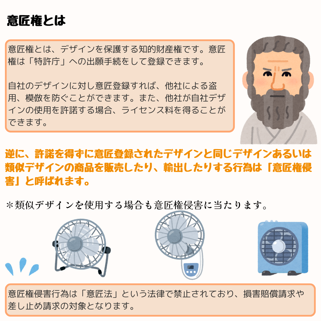意匠権とは、デザインを保護する知的財産権です。意匠権は「特許庁」への出願手続をして登録できます。逆に、許諾を得ずに意匠登録されたデザインと同じデザインあるいは類似デザインの商品を販売したり、輸出したりする行為は「意匠権侵害」と呼ばれ.........