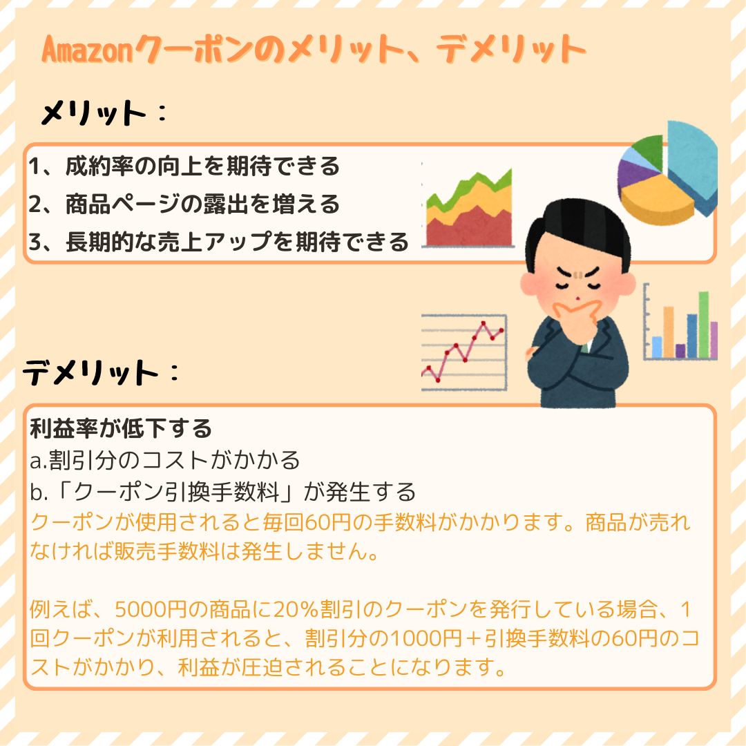 Amazonクーポンを利用することで、売上を上げるのはもちろん、商品ページを目立たせることも可能です。しかし、クーポンの予算、割引率をよく把握しないと、売上は上げるけど、利益が下がることになります。