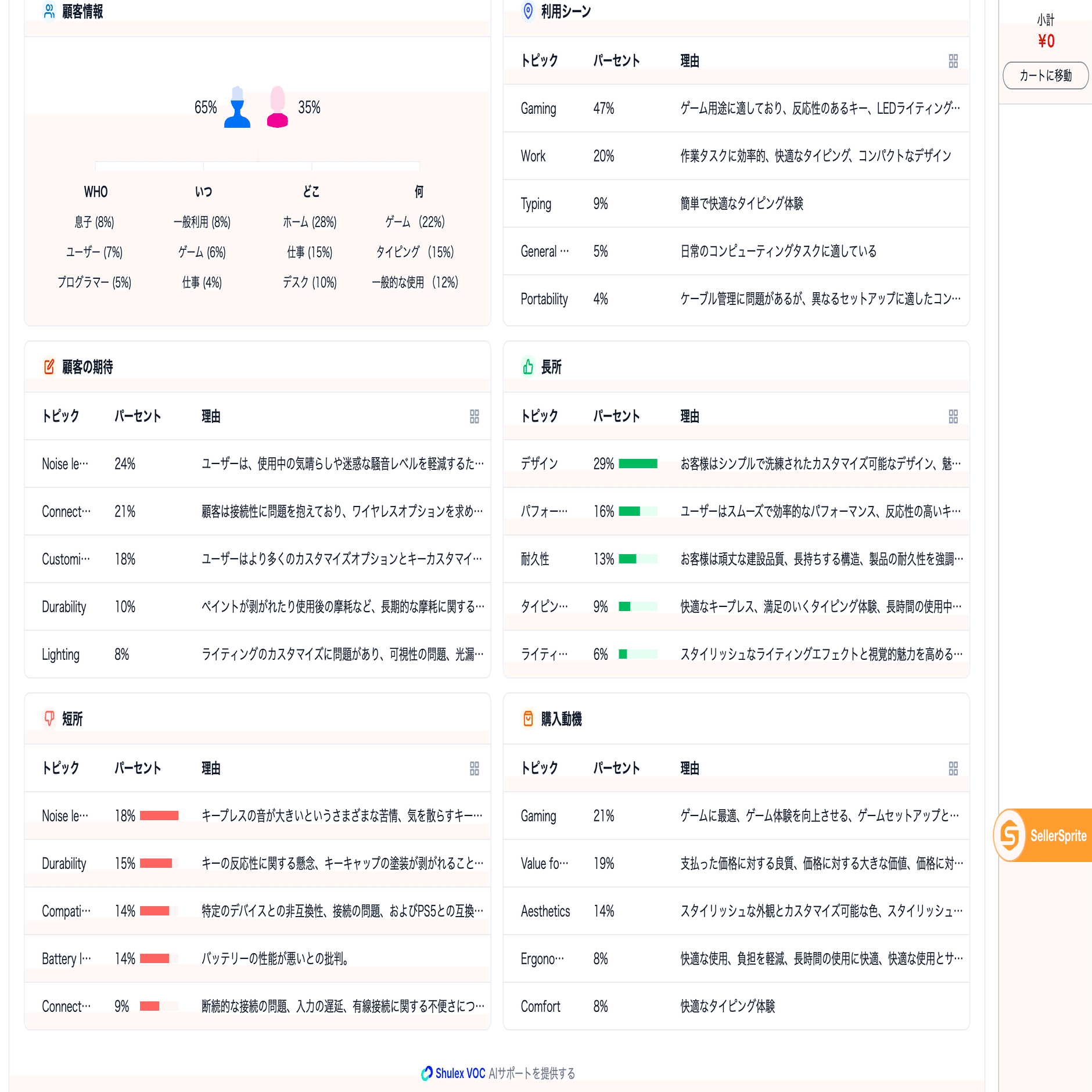 さらにAIレビュー分析機能を用いて当該製品のレポートを生成したところ、顧客の期待の欄では「打鍵音に関する改善」を求める声が24%、「キーのカスタマイズ性」に関する要望が18%、そして「打鍵体験」に関する要望が3%確認されました。これにより、販売台数の首位が必ずしも品質の首位を意味しないことが浮き彫りとなりました。また短所の項目でも、最も高い割合を占めていたのはやはり「打鍵音」に関連する不満でした。